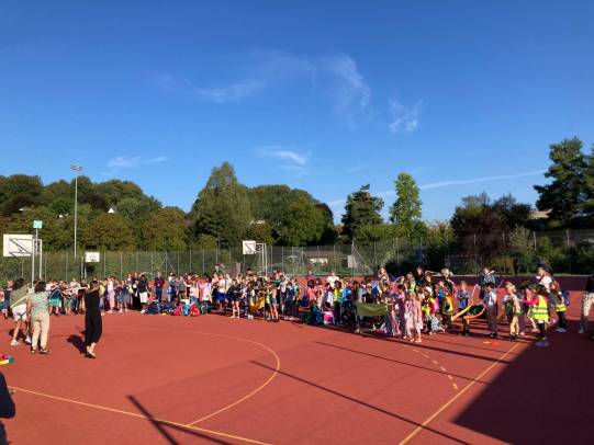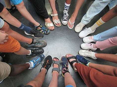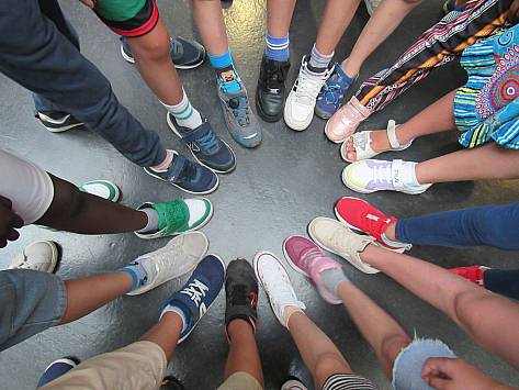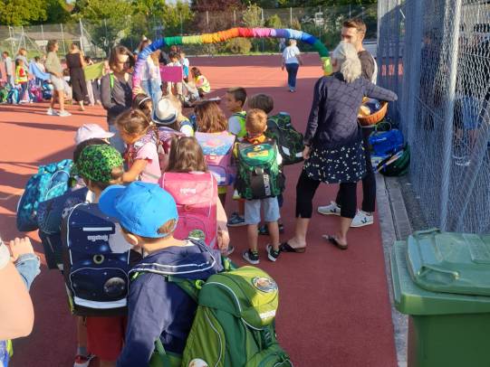 Gemeinsam starteten heute die Schulklassen vom Lindenfeld ins neue Schuljahr. Die Erstklässler*innen wurden hinter dem farbigen Bogen von ihren zukünftigen Klassen herzlich begrüsst und durch die Schulleiterin willkommen geheissen. Beim Tanz zum Song «The feeling goes on» durften dann alle mitmachen und als Klasse ihre erste Performance hinlegen. Unser Jahresmotto heisst «zäme ungerwägs fägts» - und um zusammen unterwegs zu sein brauchen wir das richtige Schuhwerk. So begleitete uns das Thema Schuhe dann durch den Morgen und es sind lustige Schuh-Klassenfotos entstanden. Welche Klasse steckt wohl hinter welchem Foto? Viel Spass beim Knobeln!
