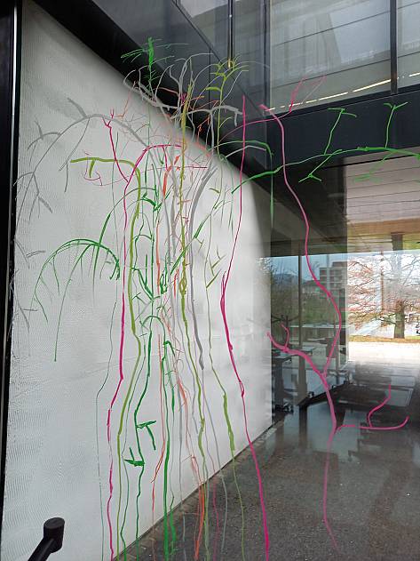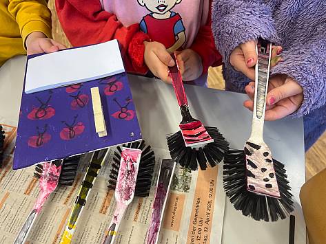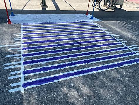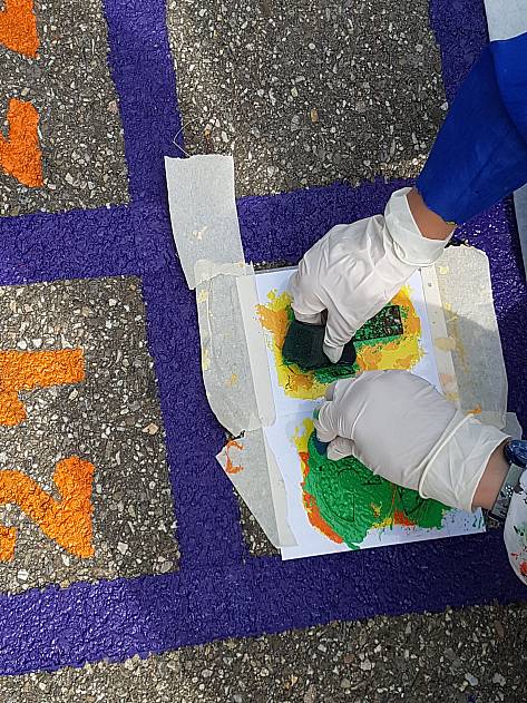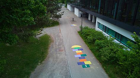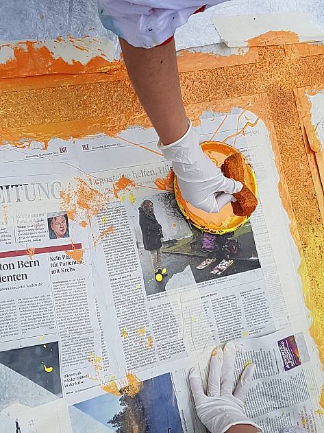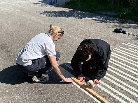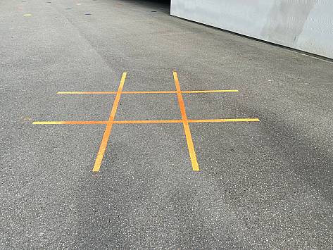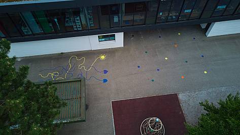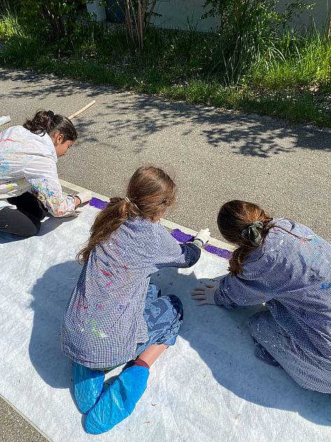 “Schau mal meine Sonne!” - “Ich brauche mehr blaue Farbe.” - “Ups, ich habe Farbe auf meinem Malschutz!” So tönte es am 4. Mai über den Pausenplatz unserer Schule. Auch ich stecke hier mittendrin und suche gerade zwei weisse Plastikhandschuhe zusammen. Die Stimmung ist nicht hektisch, sondern ausgelassen und fröhlich: Wir malen unseren Pausenplatz an! Ich und meine drei Kolleginnen stehen vor einer weissen Plastikplane, die sozusagen als Kontrollzentrum dient. Ein paar nette Mütter aus dem Elternrat sitzen dahinter. Sie haben das ganze organisiert und eingerichtet. Ich und meine Freundinnen bekommen hier nicht nur Farbe sondern auch unseren Auftrag. Weiter hinten beim Kindergarten befand sich ein Gewirr aus bunten Linien, denen man nachlaufen konnte. Wir sollten am Anfang jeder Linie ein Symbol hinmalen. Wir hatten uns schnell aufgeteilt. Ich soll eine blaue Tulpe malen. Gemeinsam und mit Hilfe des Elternrates deckten wir den Boden rund um die Malfläche mit Zeitungspapier ab. Dort konnte man dann bequem draufknien. Die Formen, die wir malen sollten, zeichneten wir vorsichtig mit Kreide vor, denn mit der Strassenfarbe sollten keine Missgeschicke passieren. Ich bekam einen Plastikbecher mit blauer Farbe und einem Pinsel in die Hand gedrückt. Na dann kann’s ja losgehen! Vorsichtig fuhr ich die Linie, die ich mit der Kreide gezogen hatte, nach. Gar nicht so einfach und vor allem dauerte es lange. Ich war mit der Umrandung meines Symbols erst nach meinen Kolleginnen fertig, die eine Sonne und zu zweit noch ein Herz malten. Doch das Ausmalen machte dann dafür umso mehr Spass. Wir konnten gut und viel Farbe auftragen und tunkten den Pinsel weit in die Farbe. Erst als kein Fleckchen mehr vom Boden zu sehen war, waren wir fertig. Nur die Sonne war ein wenig unser Sorgenkind, da die gelbe Farbe nicht so gut deckte wie die anderen Farben. Möglicherweise wird nochmals darübergemalt werden müssen. Um sicherzustellen, dass niemand durch die frische Farbe läuft, holten wir Holzstäbe, die wir um unsere Kunstwerke stellten. So konnten wir von Stab zu Stab ein gelbes Plastikband spannen, damit wirklich jeder sieht, dass er dort nicht durchlaufen sollte. Dann war unser Auftrag abgeschlossen. Auch wenn wir echt gerne noch ein wenig weitergemalt hätten, mussten wir wohl oder übel unsere Handschuhe ausziehen und wieder zurück in unser Schulzimmer. Wir hatten unseren Teil zum grossen Gesamtbild erfüllt, und konnten es am nächsten Montag so richtig bestaunen und nutzen. Wir spielten Himmel und Hölle, oder ein “Farbenfangis” mit bunten Tupfen, die auf dem Schulhof verteilt waren. Und wir freuten uns darauf, uns hier verewigt haben zu können. “Irgendwann wenn ich mal Oma bin” meinten wir, “werden wir über den Schulhof laufen und sagen können: Schau mal, das habe ich damals gemalt!”