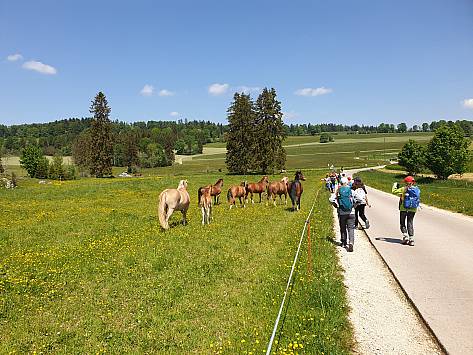 Mittwochs waren wir am Windenergiepark beim Mont-Soleil und wir waren in einem Windrad. Dann machten wir eine grosse Wanderung zu der Schokoladenfabrik Camille-Bloch und danach gingen wir mit dem Zug zurück nach Saignelégier. Am Donnerstag gingen wir zu der Stiftung für das Pferd. Das ist eine Stiftung für alte Pferde, damit sie ihren Lebensabend noch in Ruhe geniessen können. Danach wanderten wir eine halbe Ewigkeit zum Moorsee Etang de la Gruère, wo wir dann einen Auftrag hatten und um den See gingen. Als dann Freitag war, sind wir nach mit dem Zug nach Les Bois gereist und natürlich gewandert. Dort gingen wir zu einer Husky -Farm. Die Besitzerin hat 40 Huskys. Der größte davon heißt "Heaven". Die kleinste Hündin hiess Nevada. Wir gingen mit den Huskys wandern. Danach durften wir noch ein "Bad in der Meute" machen. Meine Güte,hatten diese Huskys viele Zecken! Danach gingen wir leider wieder nach Hause.