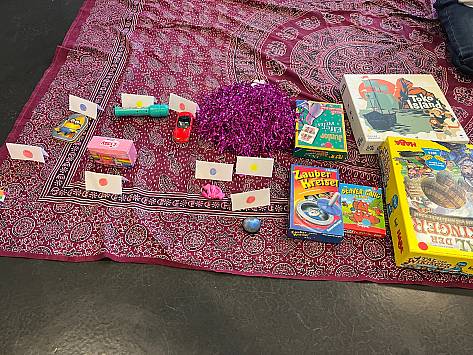 Während einer grossen Pause haben sich Kinder der 4.-6. Klasse versammelt und all ihre Gegenstände auf einem Tuch ausgelegt. Dank eines Startguthabens von 5 Chipslis (Biella-Kartonrondellen), konnten alle die mitgebrachten und nicht mehr gebrauchten Gegenstände gegen Chipslis eintauschen. Der Tausch war ein voller Erfolg - so wechselten Spiele, Bastelmaterial, Bücher, Comics und Gegenstände die Besitzenden. Viele Kinder dachten so kurz vor Weihnachten auch an ihre Geschwister und tauschten ein paar Weihnachtsgeschenke ein. Mit glücklichen Gesichtern und vielen gefüllten Taschen mit neuen Gegenständen bauten die Kinder nach einer Pausenlänge ihren Stand ab.