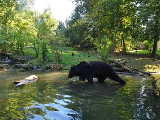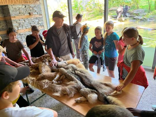 Wir hatten das Glück, die Bären und Wölfe sehr gut zu sehen und ihnen zuzusehen. Denn auch über die drei Grossraubtiere Bär, Wolf und Luchs erhielten wir viele Informationen. Dabei durften wir sogar je ein Fell berühren und begutachten.