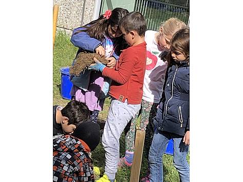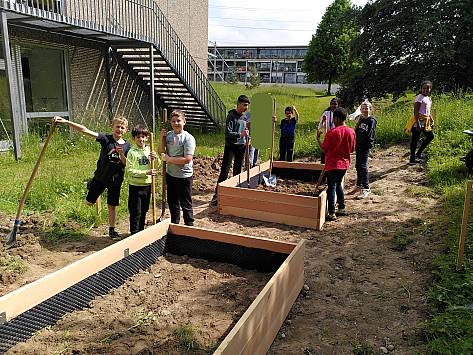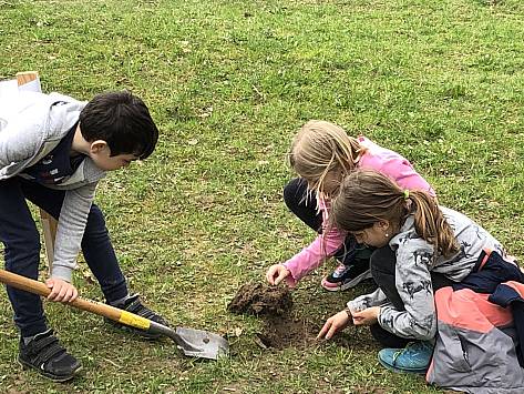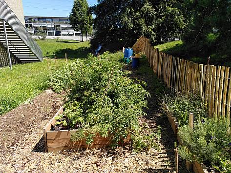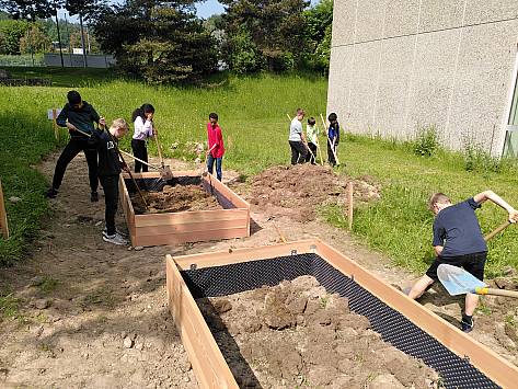 Mit viel Eifer und grosser Freude packten die Kinder an, bereiteten den Boden vor, planten, sägten und bauten Hochbeete, schaufelten etliche Kubikmeter Erde und Holzrinde umher, jäteten stundenlang invasive Neophyten, säten und setzten Pflanzen und entdeckten die Pflanzen und Insekten in der Umgebung des Schulgartens.