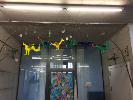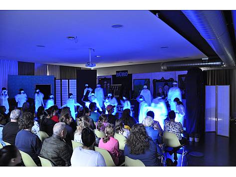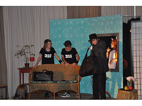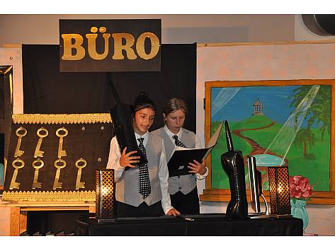 Wir haben mit der Klasse ein Theater gespielt, in dem es um ein Hotel namens Hotel Q-Rioso ging. In diesem Hotel gingen aber gruselige Dinge vor sich. Plötzlich verschwanden Kleider und man hörte gruselige Laute.