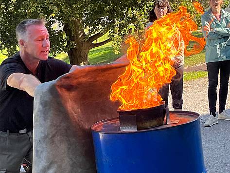 Zackig wurden unter seiner Anleitung die Feuer gelöscht, die zuvor per Knopfdruck mittels spezieller Brandsimulationsanlage entzündet wurden. Was bei Roger Hess so einfach aussah, entpuppte sich als Mutprobe: Die Pfanne mit Öl brennt lichterloh: Da gilt es die Löschdecke so in die Hände nehmen, dass diese geschützt sind. Dann mit ausgestreckten Armen die Decke ruhig über die lodernde Pfanne legen und das Feuer ersticken. „Ruhig, Schritt um Schritt, nie gäg e Wind“, ermunterte Hess. Und: Nicht nur im Zweifelsfall die Feuerwehr zu alarmieren, um ganz sicher zu sein, dass da nichts mehr schwelt, wieder aufflackert.