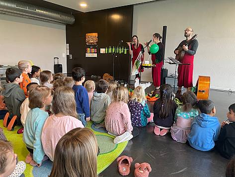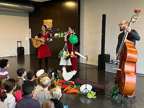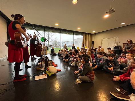 Die anfängliche Zurückhaltung und Scheu, mit denen die Schülerinnen und Schüler die beiden Frauen und dem Mann begegneten, wichen bald. Es wurde aufmerksam zugesehen, mitgemacht, mitgeklatscht, gestampf, gewunken, lautstark mitgesungen und dann wieder ganz genau zugehört. Die Komponistinnen von Hoppelihopp Katrin Zihlmann (Gesang, Gitarre, Ukulele und Cajon) und Eva Ziehlmann (Gesang, Ukulele und Handorgel) sowie Jürg Nietlisbach (Kontrabass und Halszither) zogen die Mädchen und Buben von Anfang bis Ende des Konzertes iin ihren Bann. Einstimmig sangen die Kinder nicht nur das Lied „Latärne“, sie waren sich ebenfalls einig: „Das het gfägt, isch kuul gsi.“