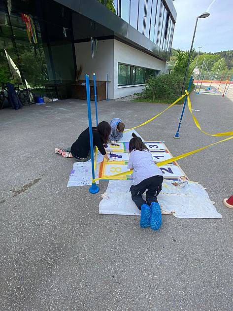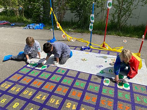 Der Elternrat hatte vor längerer Zeit bereits die Idee eingebracht, den Pausenplatz mit Hüpfspielen zu gestalten und nach den Frühlingsferien war es endlich soweit! Die Schüler*innen durften mit Unterstützung von vielen Helfer*innen aus dem Elternrat verschiedene Spiele auf dem Pausenplatzes aufmalen. Wir freuen uns sehr über die neuen Spielmöglichkeiten und die zusätzliche Farbe rund um das Schulhaus, es sieht super aus!