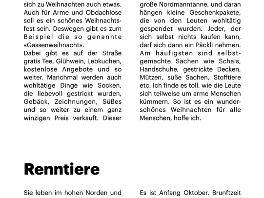 Am Freitag, 2. Dezember 2022 ist das Projekt «SchülerInnenzeitung» der am Recherchieren, Schreiben und Zeichnen interessierten Kinder der Mittelstufe gestartet. Gemeinsam haben sich die Schülerinnen und Schüler für das Thema «Weihnachten» entschieden und sich dabei kreativ - und in Anbetracht der kurzen Zeit ambitioniert - mit unterschiedlichen Darstellungsformen auseinandergesetzt. Innerhalb von drei Treffen ist dabei die nun vorliegende Erstausgabe entstanden. Wir bedanken uns bei Livio Gneist für das Layout dieser Zeitung! Die erste Ausgabe der Zeitung wurde unverändert, d. h. unkorrigiert, zusammengestellt.