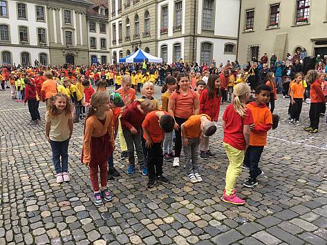 Die Klassen der Unterstufe Lindenfeld (L1, L2, L3, EK) und das Angebot der Schule «Kreativer Kindertanz» besuchten im Mai das Tanzfest in Bern. Dabei haben 1000 Kinder zusammen auf dem Münsterplatz getanzt. Ein eindrückliches Erlebnis!