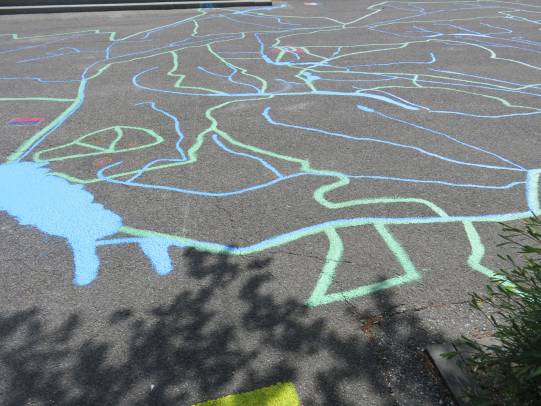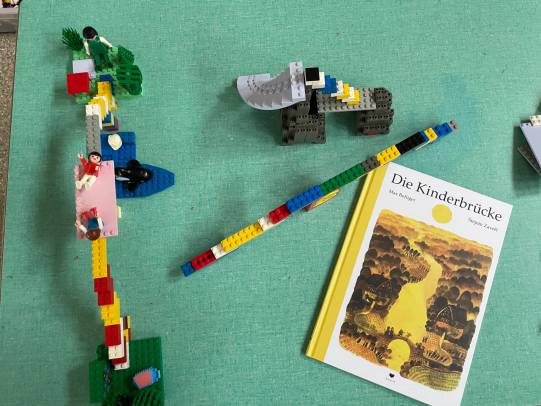 Jeweils vier Klassen verbrachten diesen Morgen gemeinsam. Dabei sollen bereits geknüpfte Freundschaften gepflegt und neue Freundschaften geschlossen werden. Das Bilderbuch „Die Kinderbrücke“ führte uns hin zum Thema Brücken bauen zueinander. Dieses Thema begleitete uns durch den Morgen, Bauklötze, Lego und Strassenkreiden wurden zu leuchtenden Brücken der Begegnung.